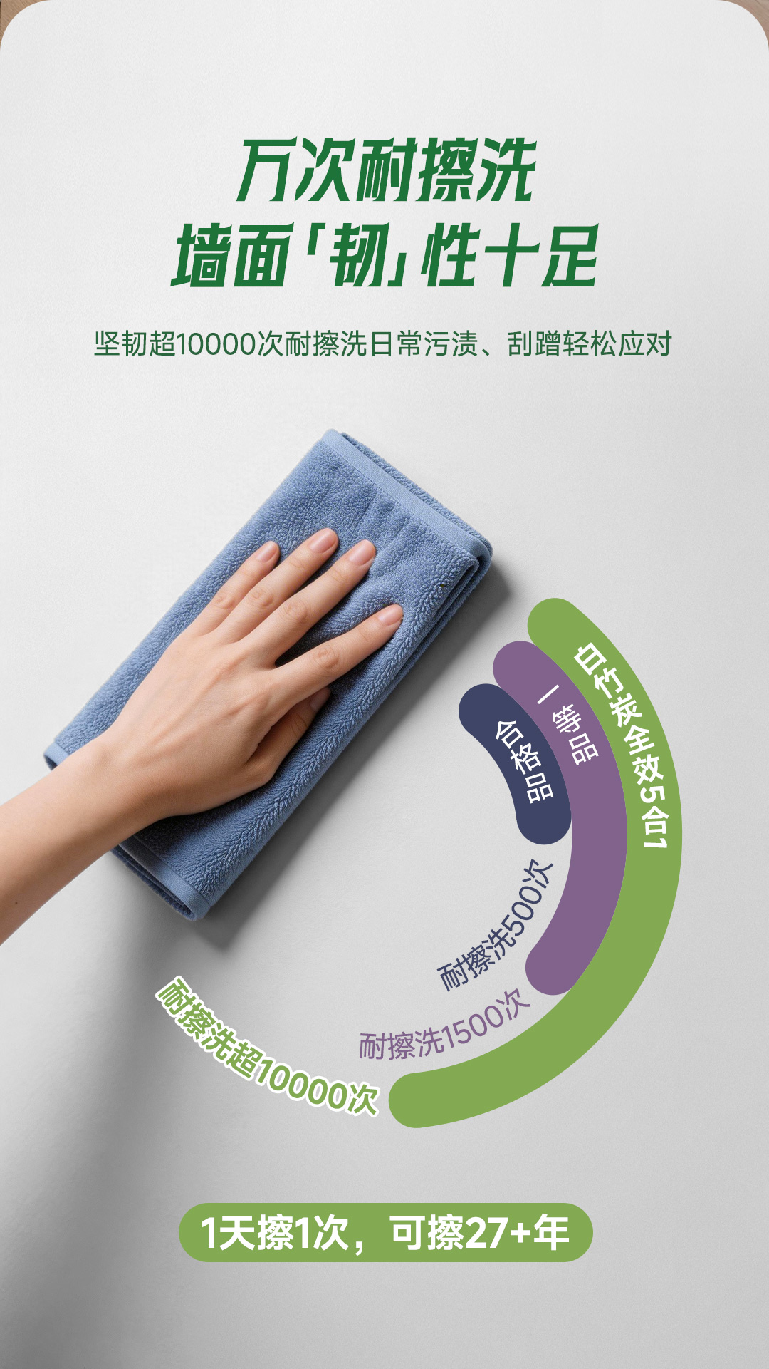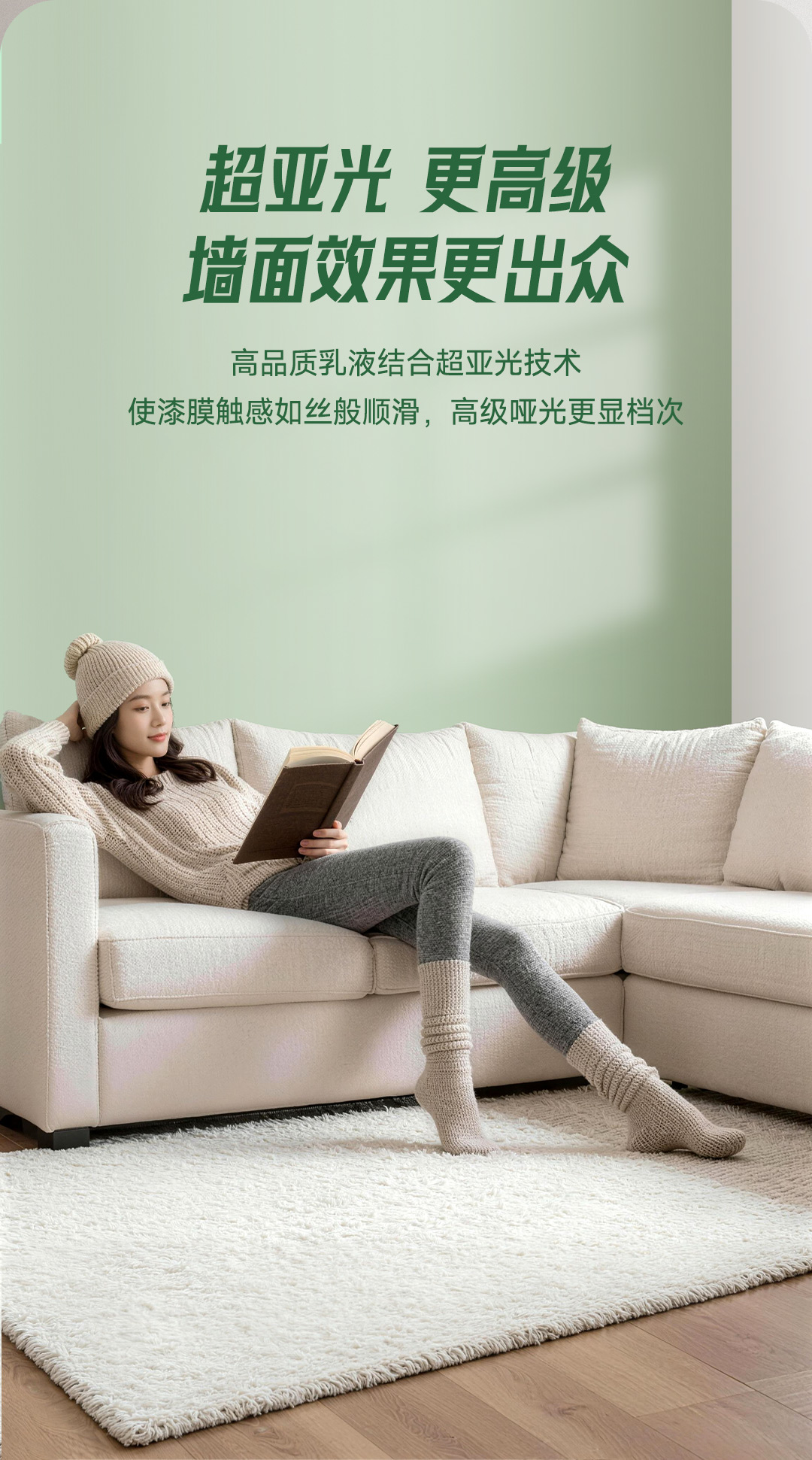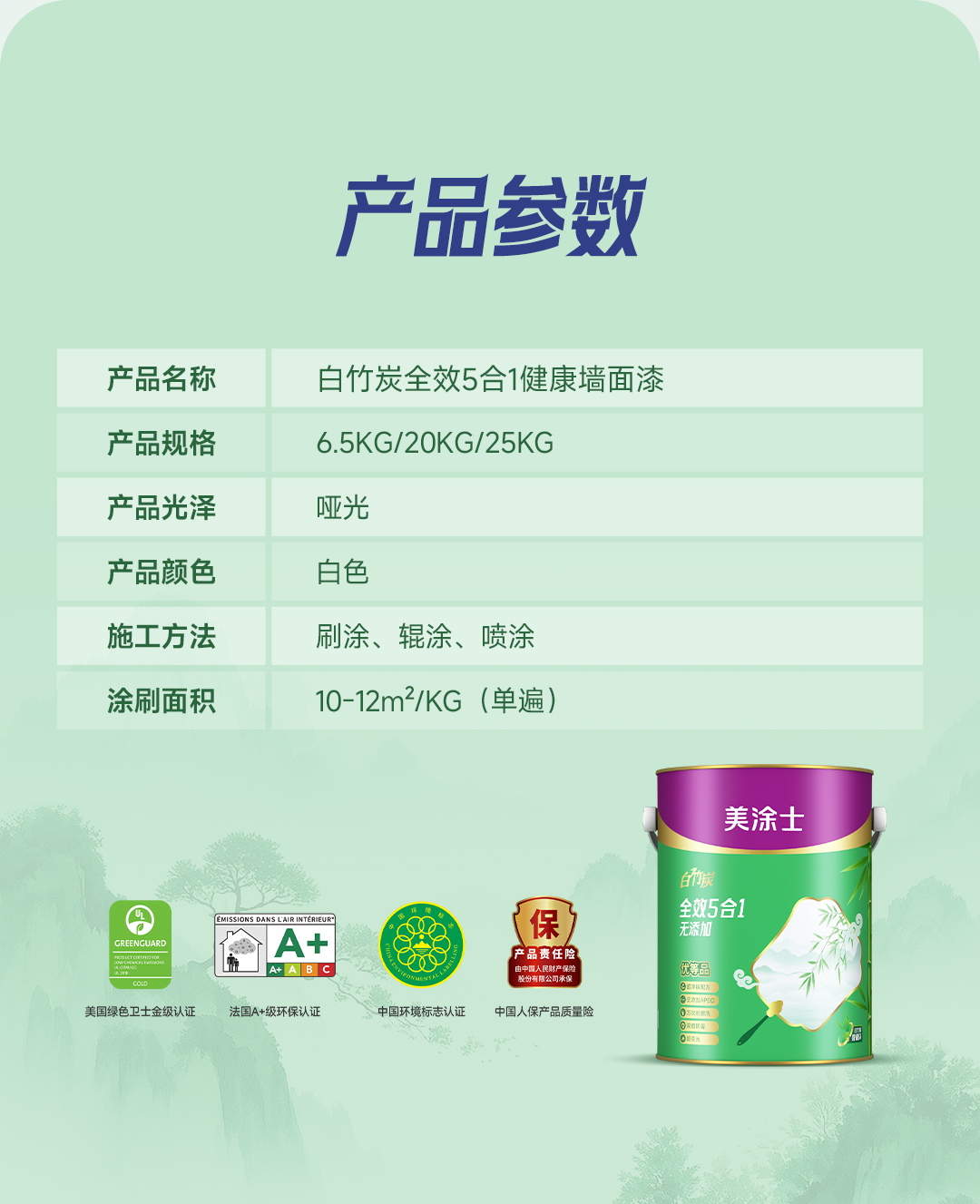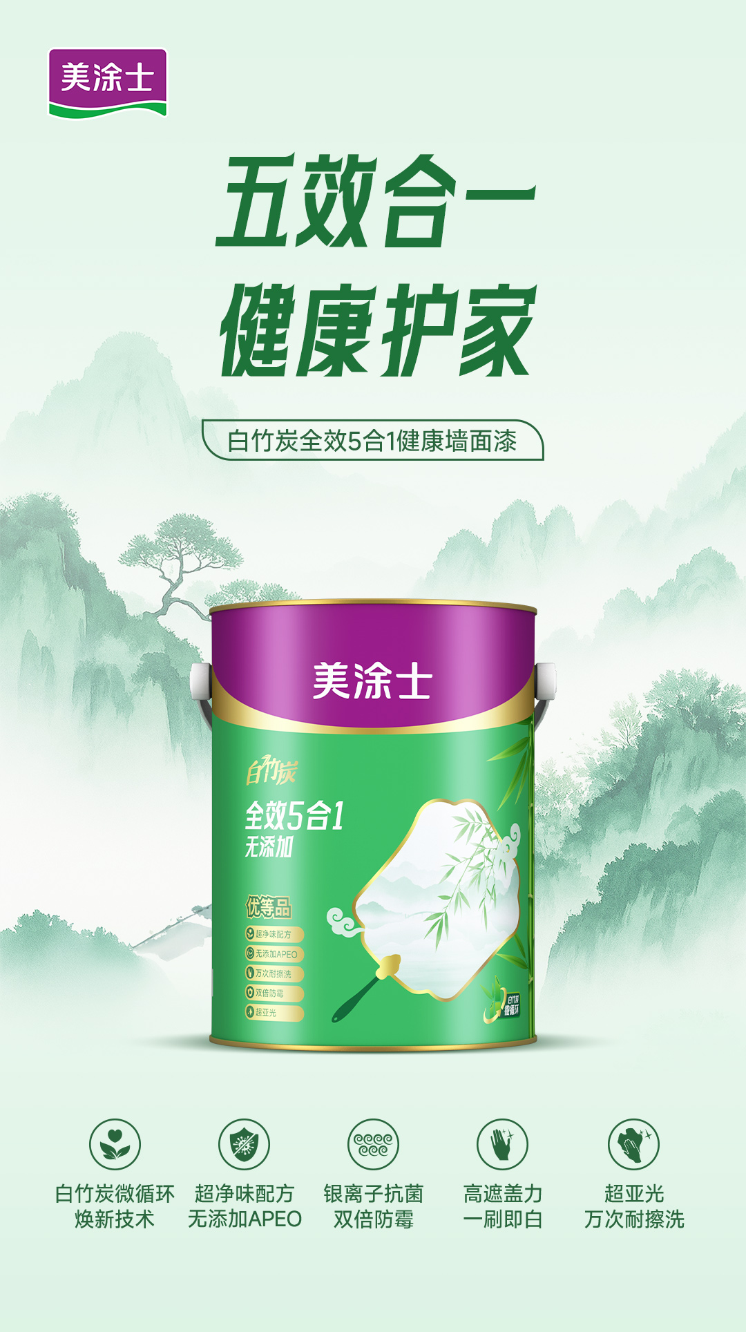 白竹炭全效 5 合 1 健康墙面漆特别添加白竹炭因子,使用净味原材料及净味技术,双核净味,气味清新;在生产过程中不添加 APEO,环保安全;产品配方皓白,遮盖力好,易于施工;同时漆膜细腻,手感爽滑,是打造健康环保,持久靓丽墙面的理想选择!