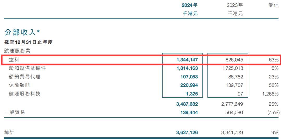 根据财报,中远海运国际涂料分部2024年销售收入为13.441亿港元(约合人民币12.446亿元或1.731亿美元),同比大增63%,增长主要由于集装箱涂料、工业重防腐涂料业务的需求强劲增长所致。分部所得税前利润为3.298亿港元,同比增长29%,主要受惠于涂料业务销售收入大幅增长。